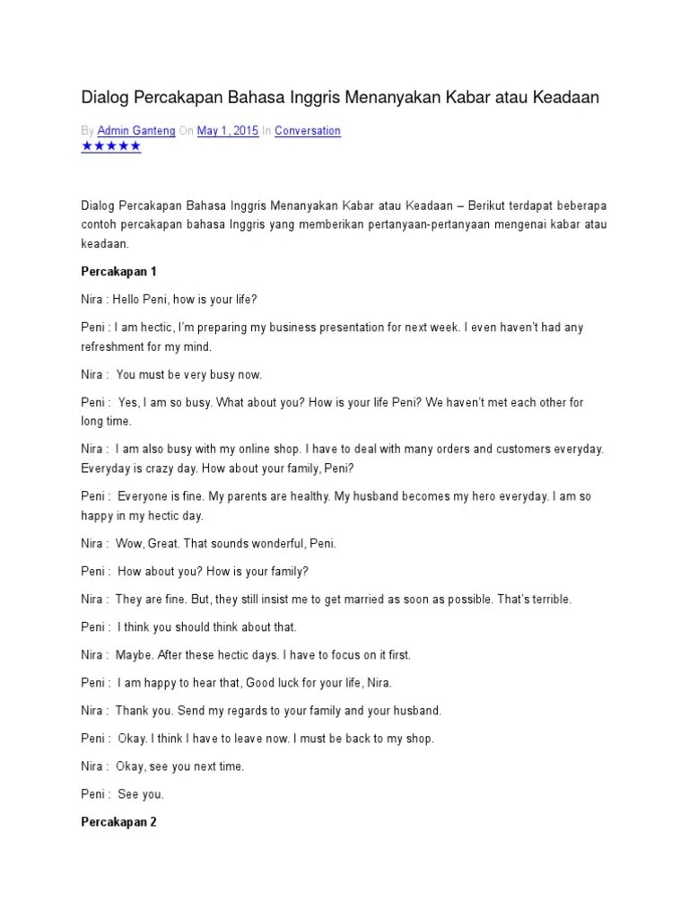 · how was your day? Aduh hanya mengetahui bhs inggris loh, saya bukan sarjana bhs inggris loh, tapi saya coba deh dengan jwbn seperti biasa saya komunikasi dengan mereka atau . · how is it going? Bagi kamu yang ingin menayakan kabar kepada seseorang dengan menggunakan bahasa inggris, maka kamu perlu membaca artikel berikut ini. Contoh dialog percakapan menanyakan kabar dalam bahasa inggris dan artinya. Anda hanya perlu menanyakan "how are you?" yang dapat diartikan menjadi "bagaimana kabar . · how do you do? Cara menanyakan kabar menggunakan bahasa inggrissemoga bermanfaat. Search over 14 million words and phrases . Saat menanyakan kabar kepada orang lain dalam bahasa inggris, kalimat yang terpikirkan tentu saja, "how are you?". Jawaban ini paling sering digunakan untuk menjawab pertanyaan yang menanyakan kabar kita. Hi, bagas (hai, bagas.) bagas: Menanyakan kabar dalam bahasa inggris adalah hal yang cukup mudah.