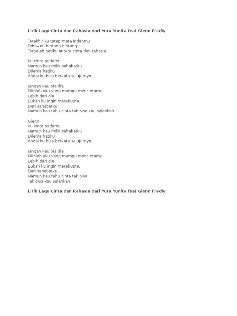 Lagu berjudul cinta dan rahasia dipopulerkan oleh yura yunita feat glenn fredly. yura: terakhir kutatap mata indahmu. Dibawah bintang bintang terbelah hatiku antara cinta dan rahasia Menjadi single kolaborasi hit, lagu 'cinta dan rahasia' dari . Inilah chord kunci gitar dan lirik lagu cinta dan rahasia. Lagu tersebut masuk dalam album yura. Lirik lagu dan download original mp3 yura yunita ft. Walaupun dibawakan dengan suara gitar yang sederhana, namun lagunya enak sekali didengarkan dan membuat hati adem walaupun lirik lagunya tentang dilema . Layanan mobile dari situs entertainment terbesar indonesia, kapanlagi.com. Terakhir kutatap mata indahmu dibawah bintang bintang terbelah hatiku antara cinta dan rahasia . intro a d a e Antara cinta dan rahasia +. Yura yunita feat glenn fredly.