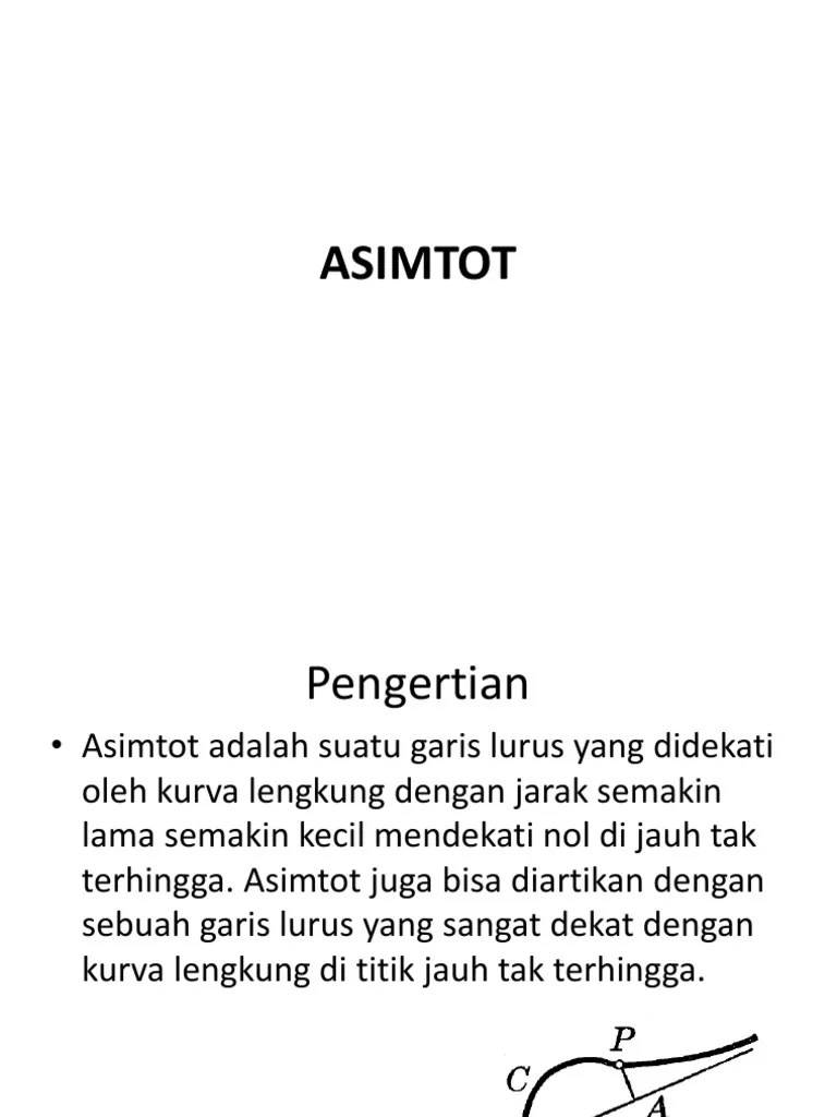 Memiliki arti menurut kamus atau subyek glosarium dan apa yang dimaksud kata asimtot? Sekarang lebih lengkap rasanya kalau kita bahas asimtot miring. Dalam geometri analitis, asimtot (asymptote) dari sebuah kurva adalah berupa sebuah garis yang sedemikian rupa sehingga jarak antara kurva dan garis tersebut . Jika x = c merupakan asimtot tegak dari grafik fungsi f(x) jika salah satu dari pernyataan berikut . Jika atau , maka garis mendatar y = l dinamakan .